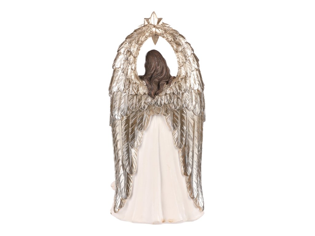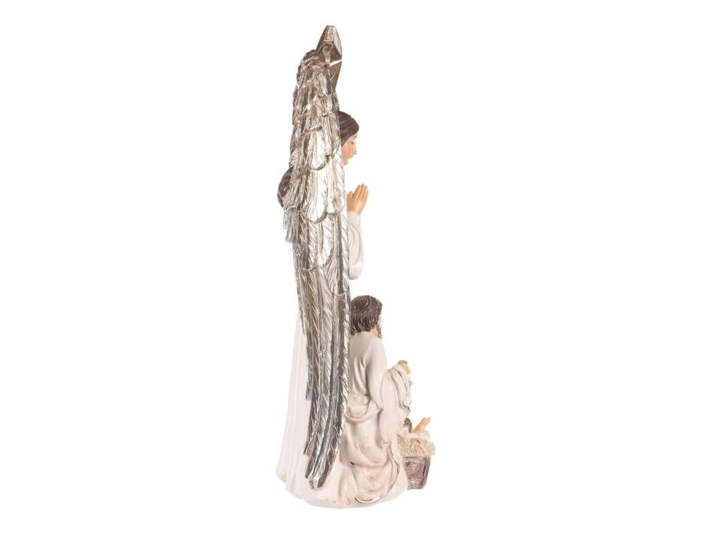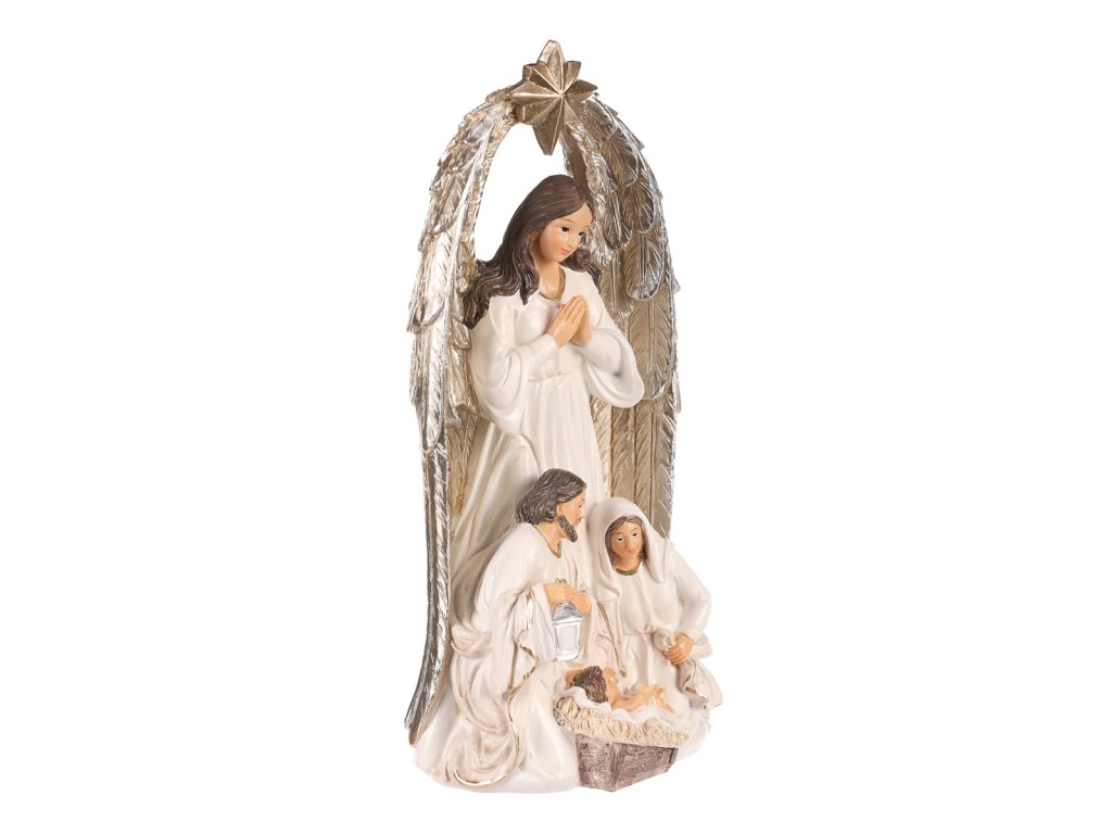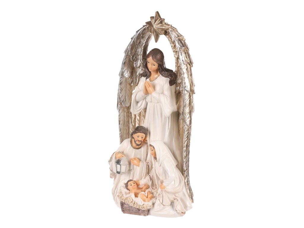 | Vyzdobte si patřičně svůj prostor o vánočních svátcích právě touto soškou svaté rodiny s andělem. Je vyrobena z polyresinu a představuje nám okamžik, kdy panna Marie a svatý Josef klečí u narozeného Ježíška. Hlavní dominantou však je velký anděl s hvězdou, stojící za nimi, který nad celou rodinou dohlíží a žehná jim. Tato dekorace na postavení je hlavním symbolem Vánoc, která nesmí ve vaší sbírce chybět. Přinese vám do domova odkaz důležitosti rodiny a zachování tradic. Umístěte ji na vhodné místo a nechte ji rozšířit pokojnou atmosféru a pohádkový dotek svátků. |