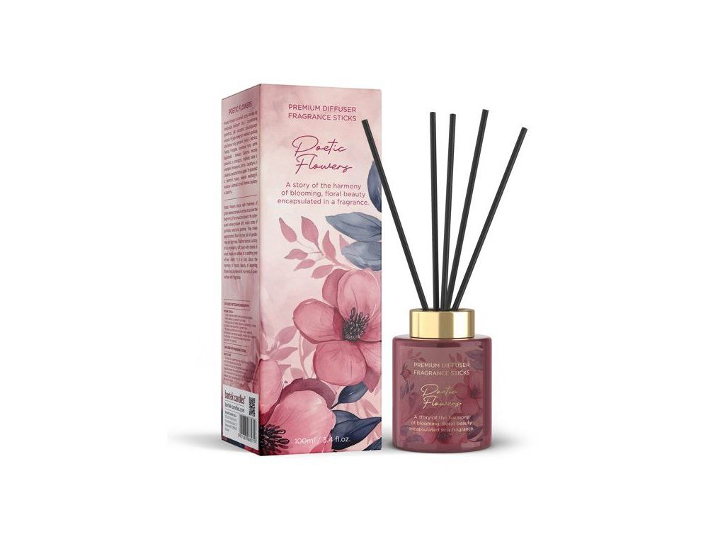 Difuzér s oblíbenou vůní Poetic Flowers, esence na bázy alkoholu, umístěte dřevěné tyčinky do lahvičky 100ml, vůně se do tyčinek natáhne a provoní celý interiér až na 45 dní, rozměr dózy: průměr 6,5 x 8cm, délka tyčinek: 20cm, rozměr balení: 7 x 7 x 20cm