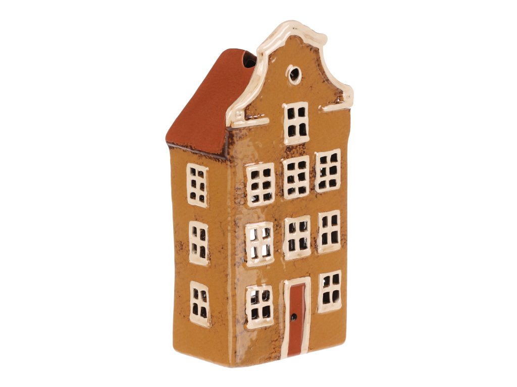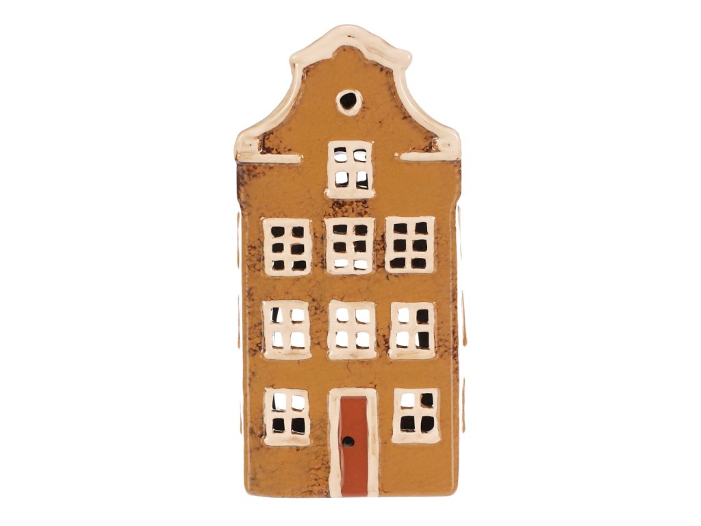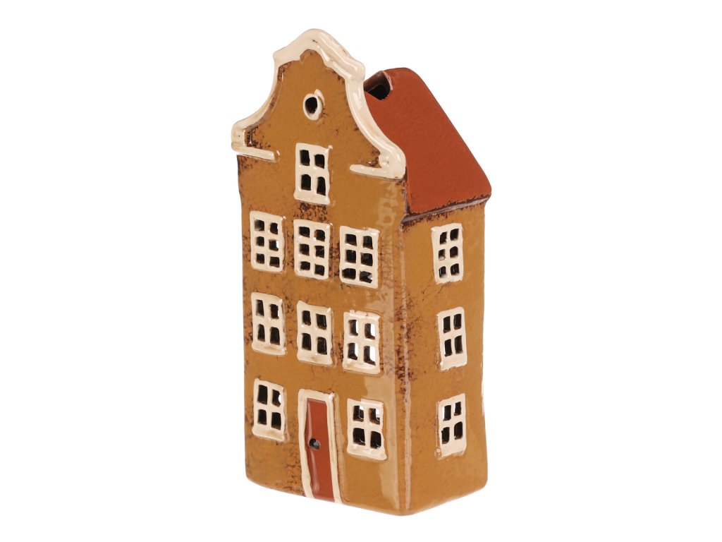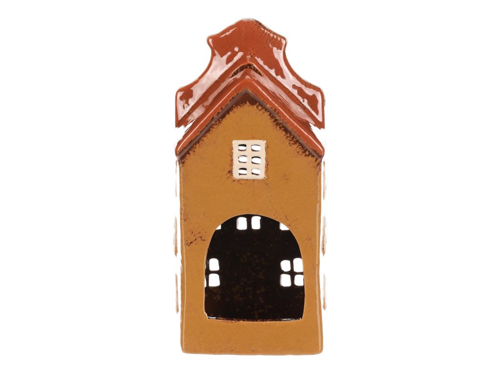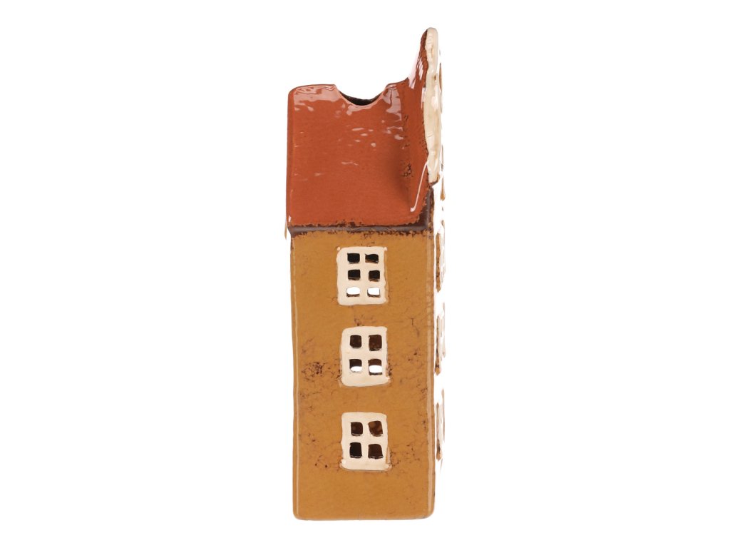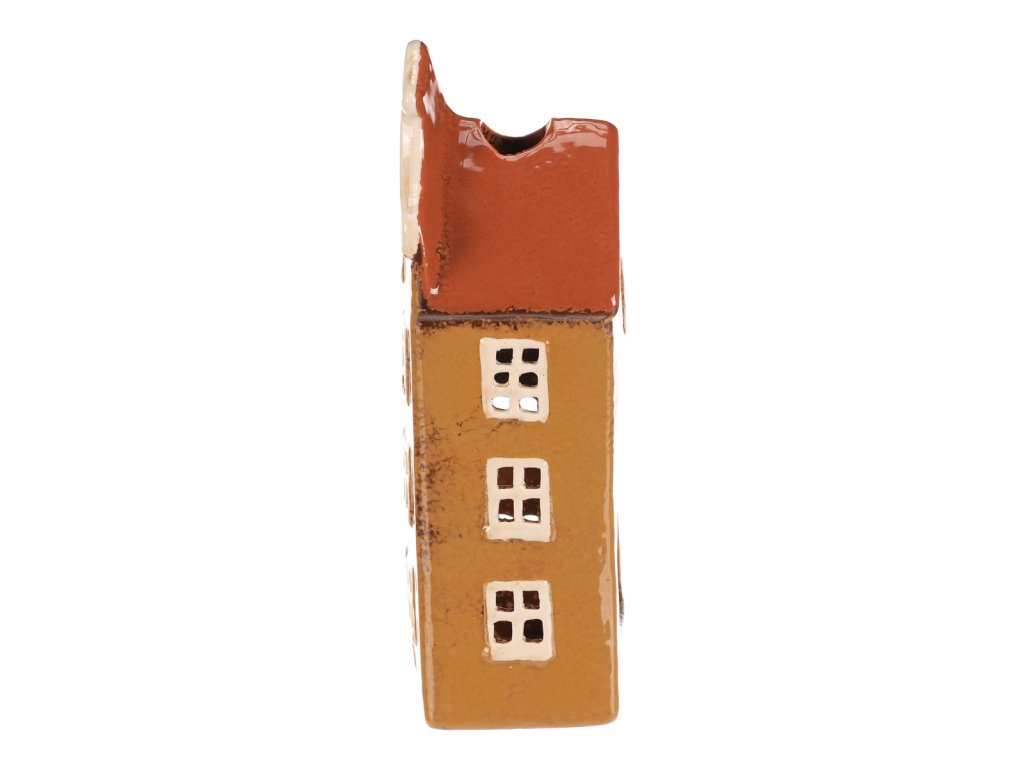 | Keramický několikapatrový domek se světle hnědou až okrovou fasádou a červenou střechou je jako vystřižený z malebného historického náměstí. Prostor na čajovou svíčku zajišťuje neodolatelný světelný efekt, kdy paprsky světla pronikají skrze všechna okénka. Ideální dekorace, která vnese do vašeho domova hřejivou a kouzelnou atmosféru. |