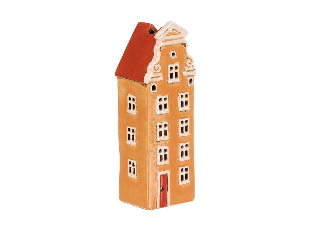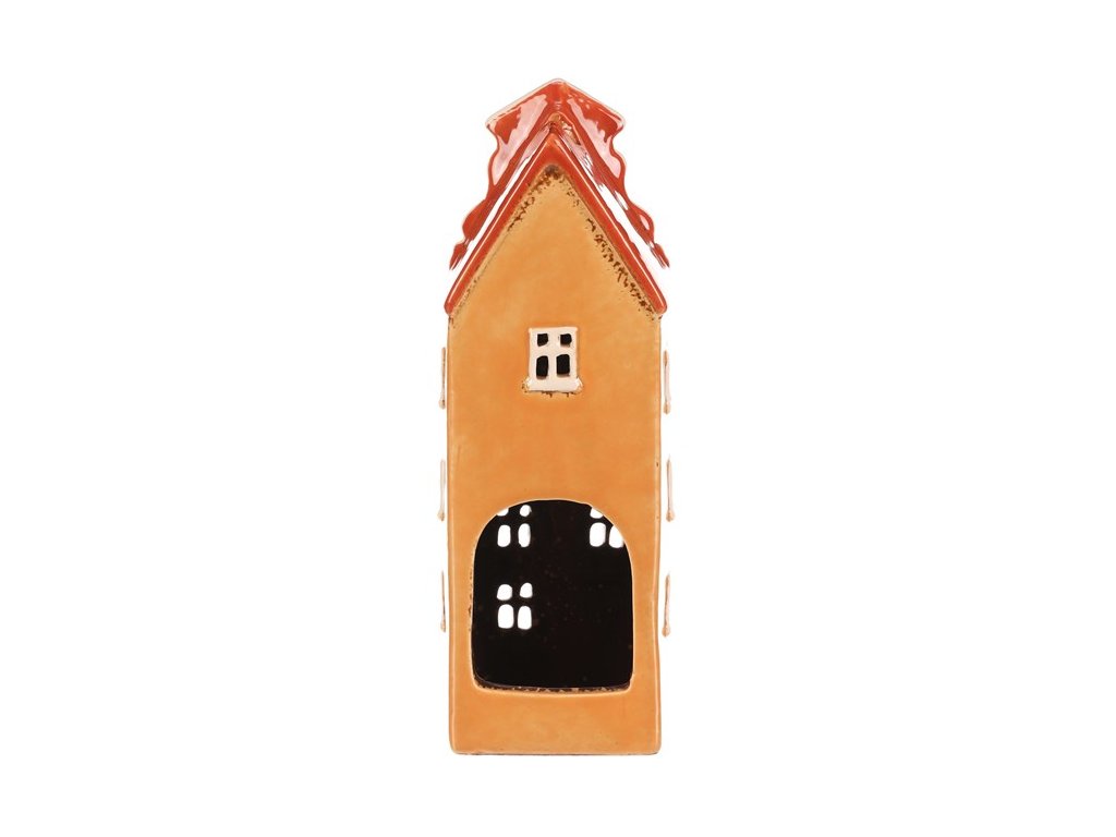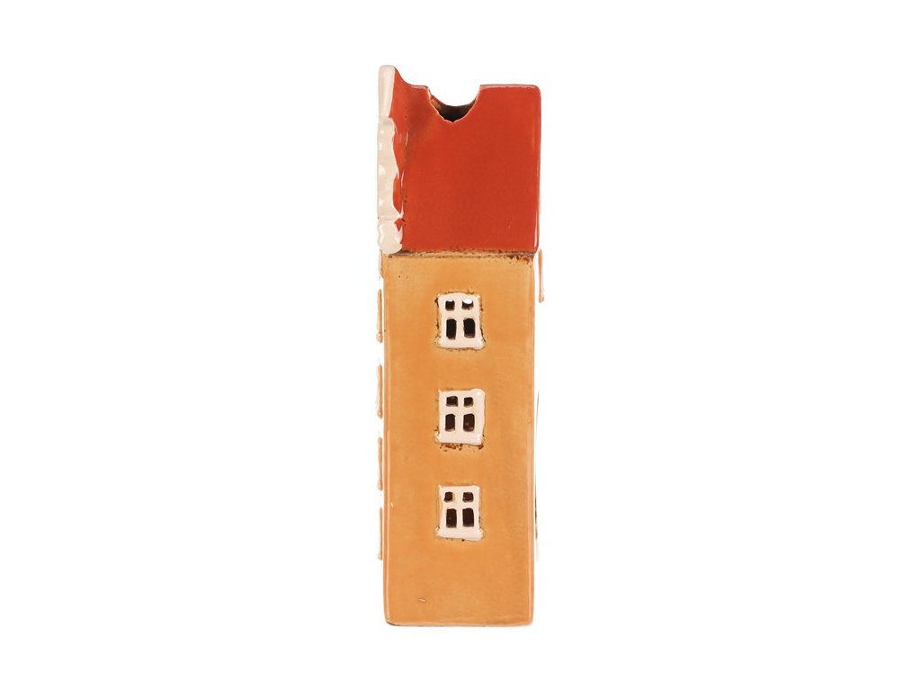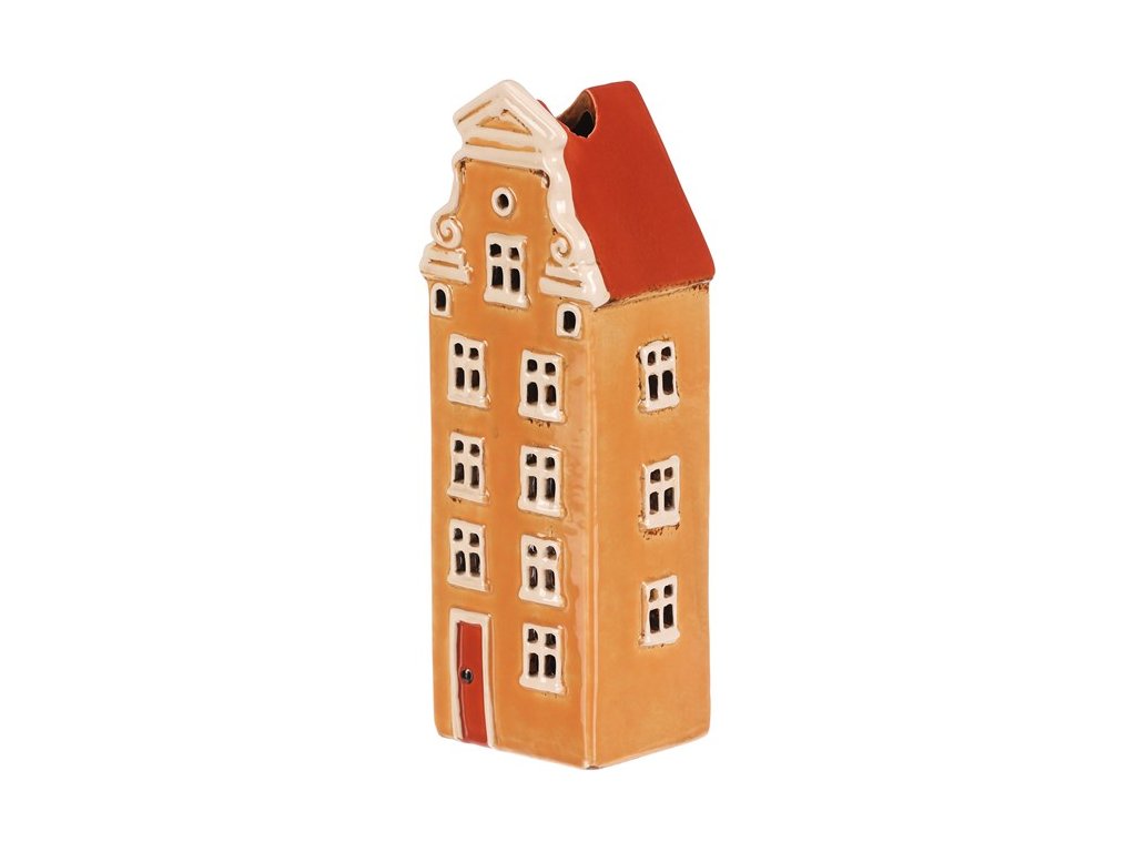 Keramický několikapatrový domek s oranžovo-okrovou fasádou a červenou střechou je jako vystřižený z malebného historického náměstí. Prostor na čajovou svíčku zajišťuje neodolatelný světelný efekt, kdy paprsky světla pronikají skrze všechna okénka. Ideální dekorace, která vnese do vašeho domova hřejivou a kouzelnou atmosféru.