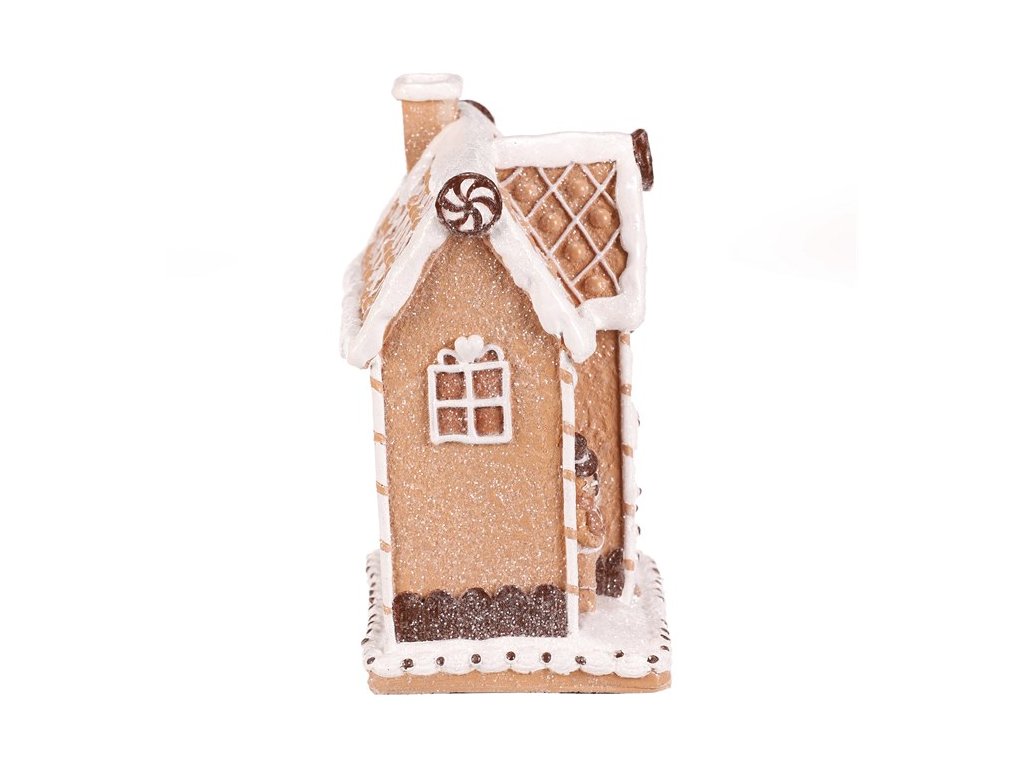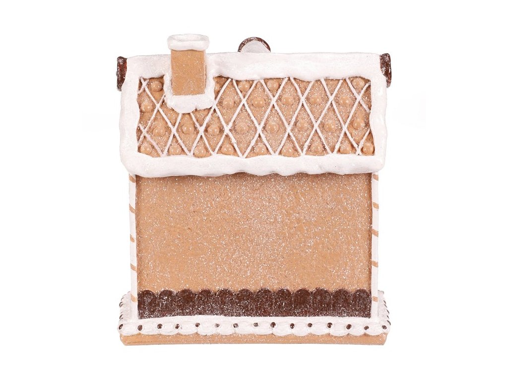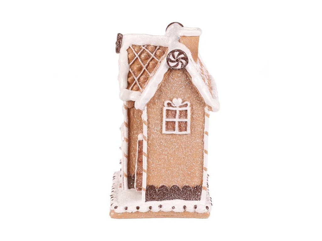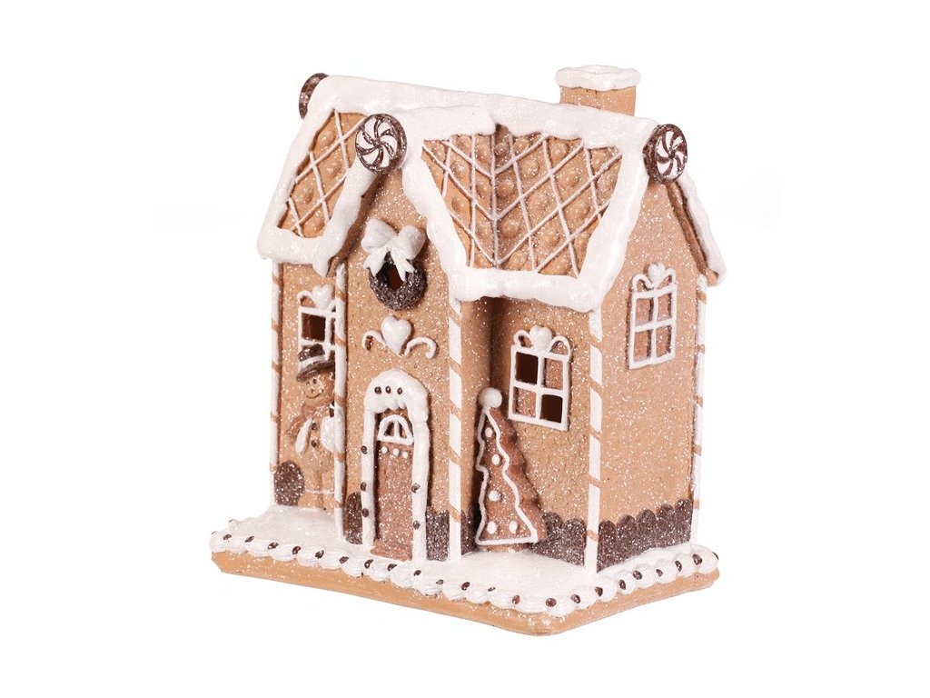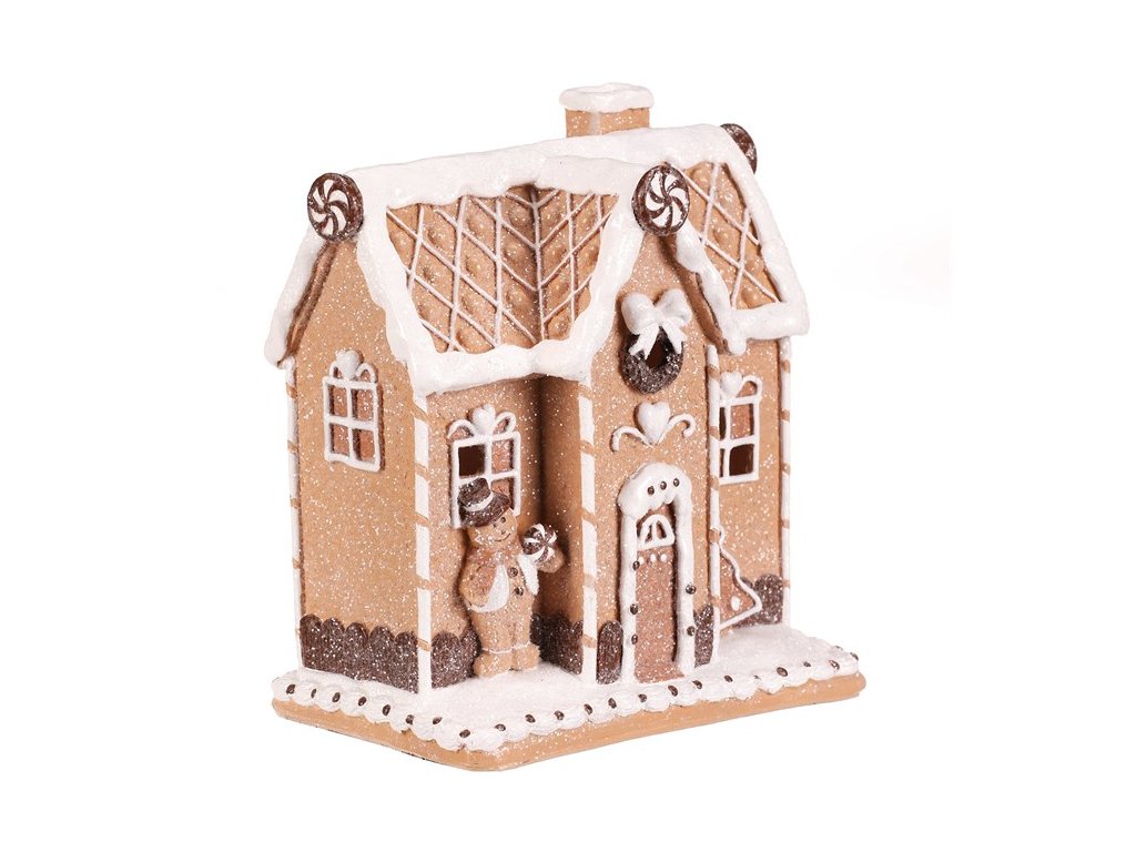 Perníkový domek s panáčkem z polyresinu, vybavený LED osvětlením, je vánoční dekorace, která přinese do vašeho domova kouzlo zimní pohádky. Hnědo-bílá kombinace a jemné detaily po rozsvícení vytvoří teplý a magický světelný efekt, který oživí vaše sváteční aranžmá.