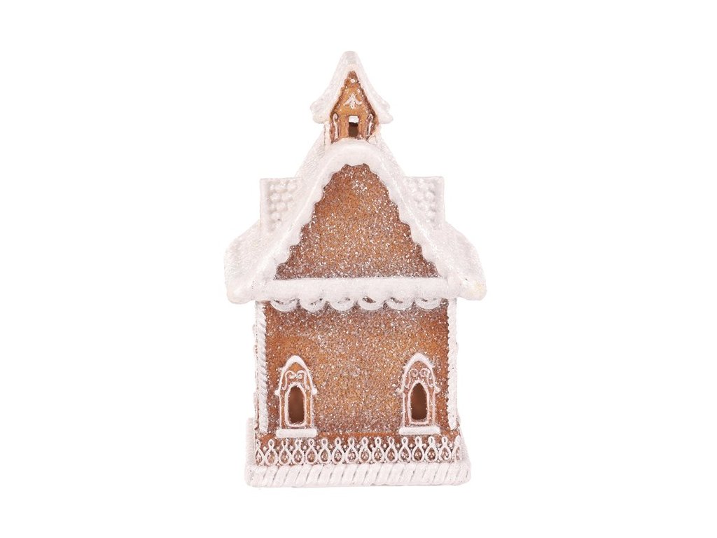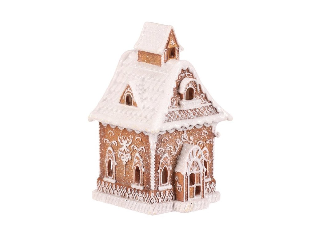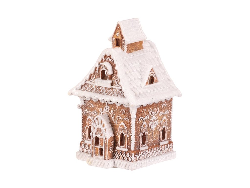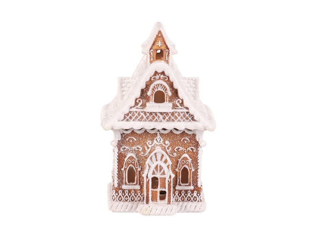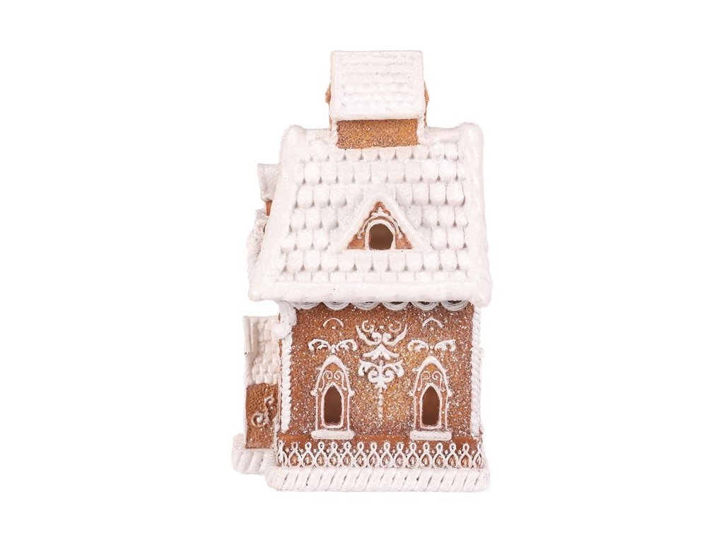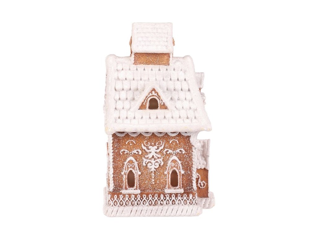 Polyresinová stolní dekorace, v podobě zdobeného domku v perníkovém designu, bude nádhernou dekorací pro kouzelné vánoční období. Vypadá jako by byl skutečně vytvořen z perníku a ozdoben sladkou bílou polevou. To ale ještě není vše! Díky zabudovanému LED osvětlení uvnitř, si můžete po jeho rozsvícení vychutnávat pohled na nádherně rozptýlené paprsky, které vycházejí skrze všechna okénka ven.