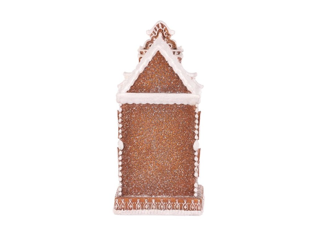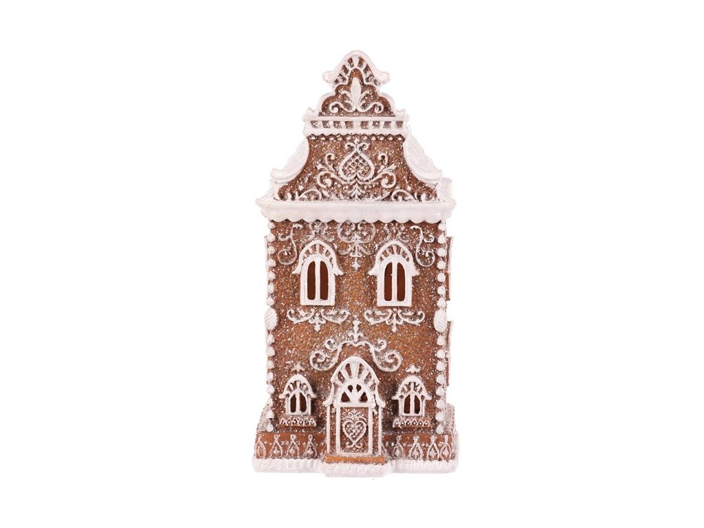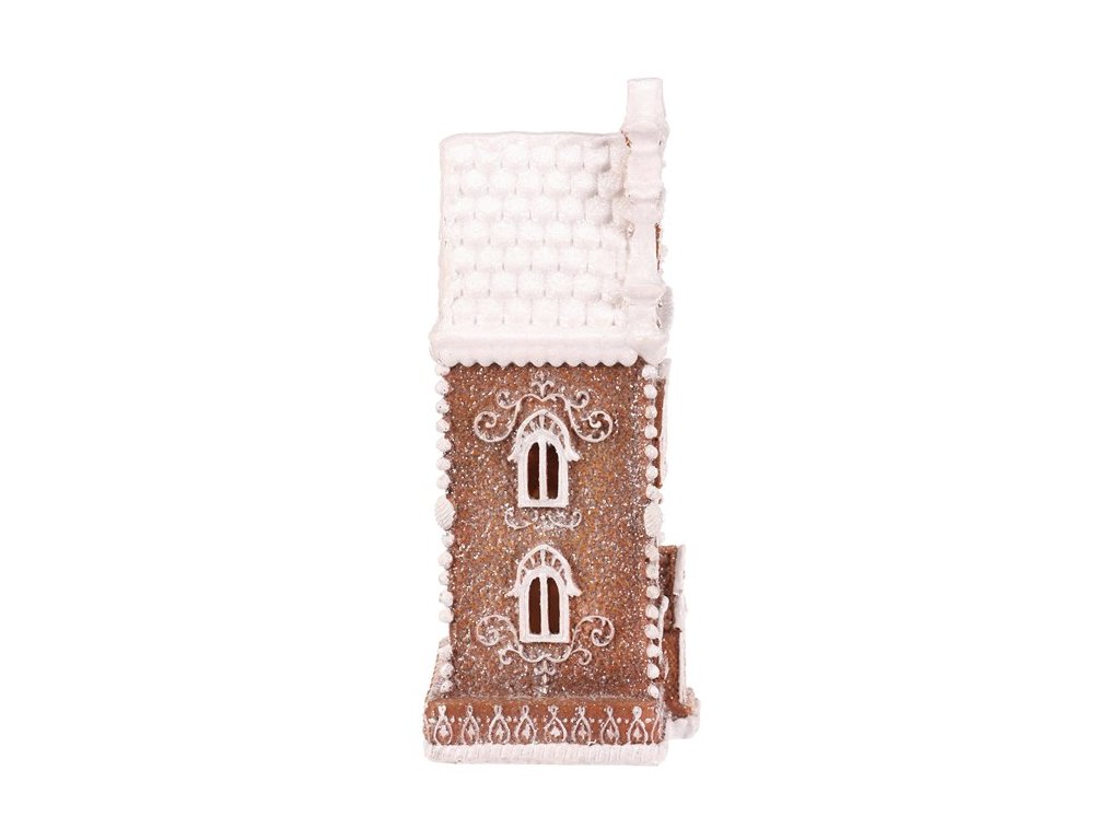 Polyresinová stolní dekorace, v podobě zdobeného patrového domku v perníkovém designu, bude nádhernou dekorací pro kouzelné vánoční období. Vypadá jako by byl skutečně vytvořen z perníku a ozdoben sladkou bílou polevou. To ale ještě není vše! Díky zabudovanému LED osvětlení uvnitř, si můžete po jeho rozsvícení vychutnávat pohled na nádherně rozptýlené paprsky, které vycházejí skrze všechna okénka ven.