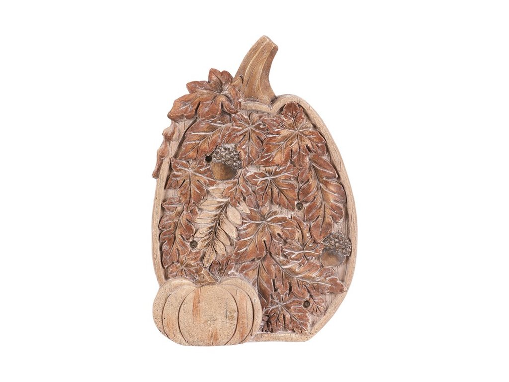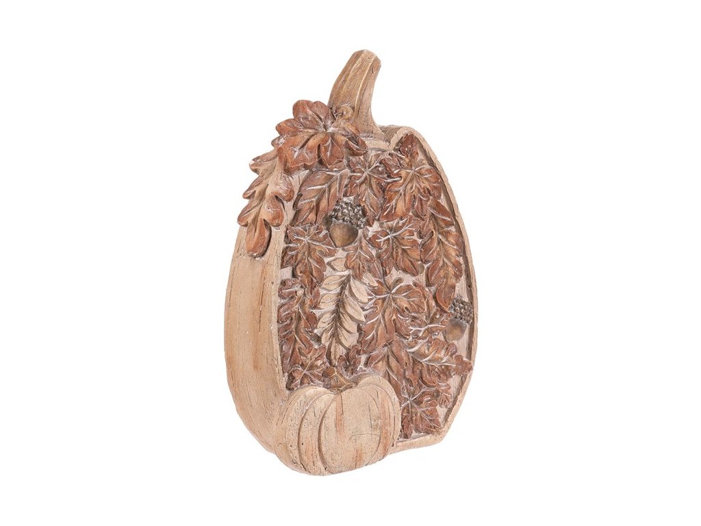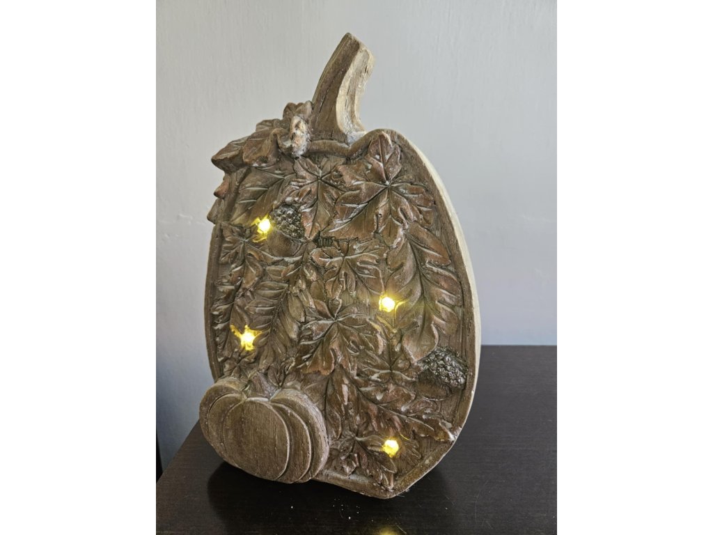 Dýně s osvětlením v imitaci dřeva a s podzimním listím se žaludy přináší do vaší zahrady kouzelnou podzimní atmosféru. Vyrobená je z magnesia, ale svým zpracováním skvěle zapadne mezi dřeviny a keře. Dekorace je vybavena osvětlením, díky kterému můžete rozsvítit vybrané místo, čímž vytvoříte zejména za temných večerů, skutečně tajemnou atmosféru. Tato dekorace je skvělou volbou pro zahradu, terasu, balkon, případně i stylovým prvkem vybraného místa v interiéru.