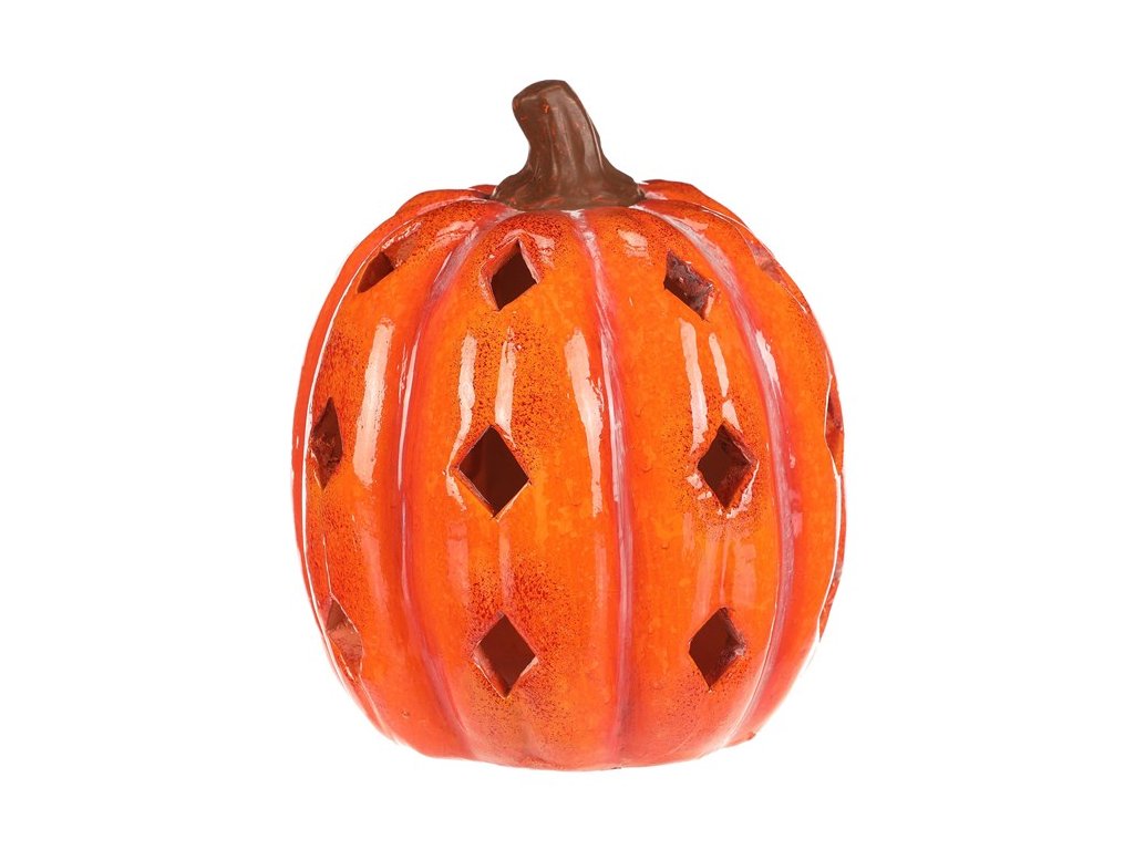 Oranžová dýně z keramiky s lesklým povrchem a prostorem, ve kterém je umístěné LED osvětlení, navodí tu pravou podzimní atmosféru. Po obvodu se nachází hranaté otvory v prizích, kterými budou po rozsvícení umělé svíce efektně procházet paprsky světla.
