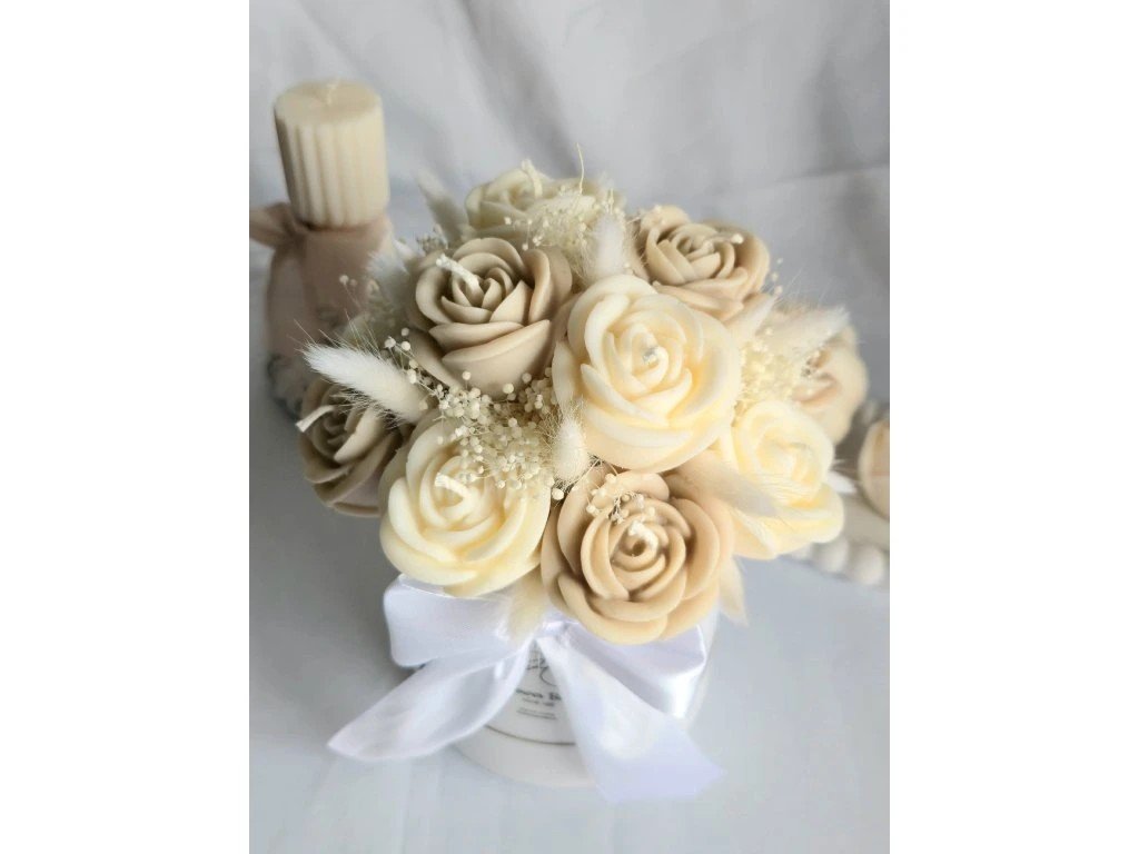 Každá růže je ručně odlitá ze 100% sójového vosku a provoní interiér vybranou vůní. Flower box obsahuje celkem 10 svíček ve tvaru růží, doplněných dekorativními prvky pro jedinečný vzhled.