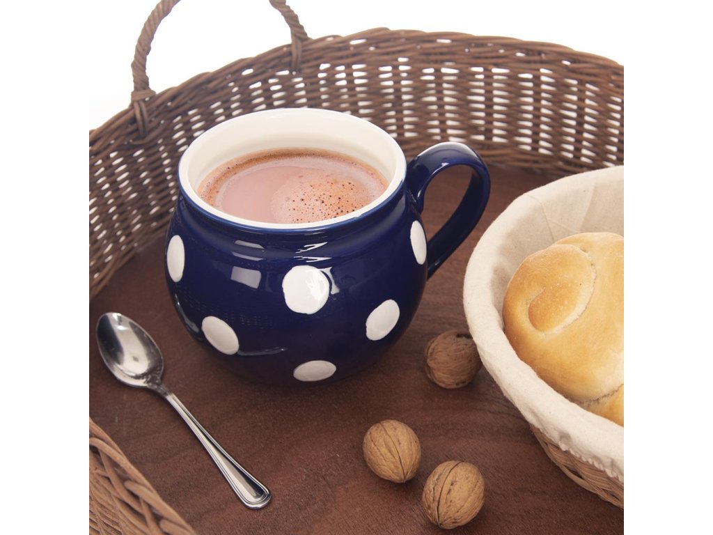 Dáváte-li přednost velkým hrnkům před malými šálky, máme pro vás tento keramický hrnek KRAJÁČ o objemu 750 ml. Spojení modré barvy a bílých puntíků mu dodává nádech dob minulých, díky čemuž je hrnek i krásnou dekorací nejen do interiéru venkovských chalup, ale i moderních kuchyní.