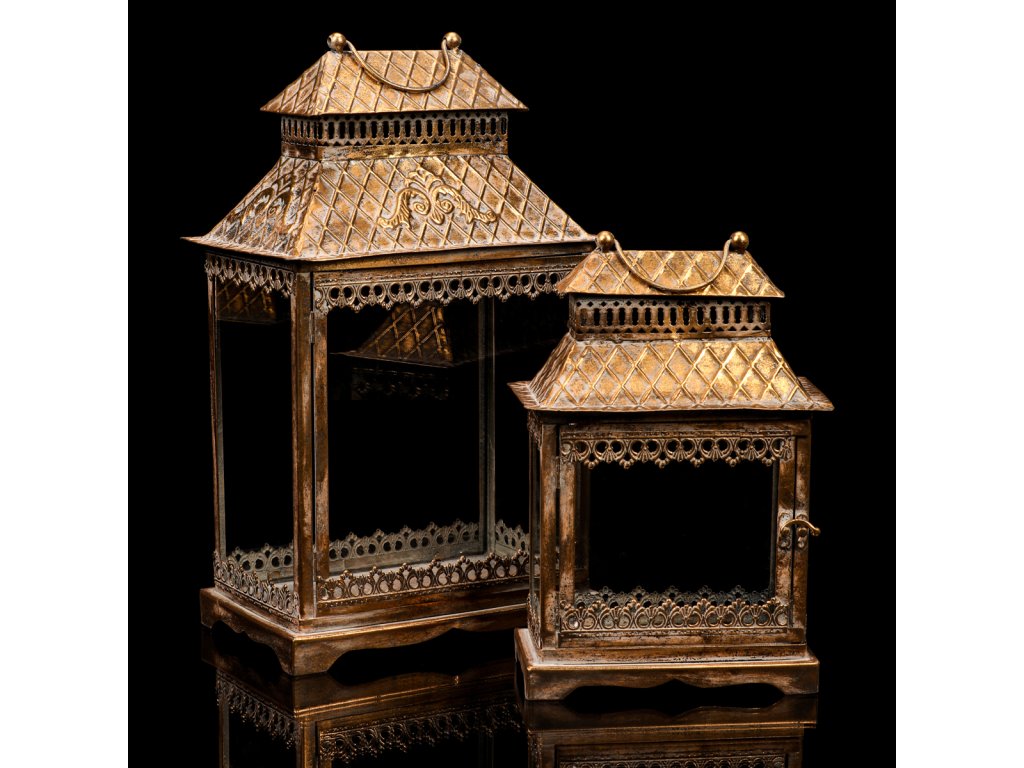 Zlatá čtyřboká kovová lucerna, vám přináší noblesu a eleganci spojenou s možností vytvořit neodolatelný světelný efekt. Zlatá barva rámů a stříšky doplněná čirým sklem ze všech stran, navíc se starožitným, zdobeným vzhledem, povýší vaše každodenní chvilky při večerech, na královskou úroveň. S tímto unikátním artiklem, který věrně připomíná cenný předmět s historickou hodnotou, se budete cítit jako host na královském dvoře, zářící luxusem. Přiveďte si do svého interiéru tento unikátní ozdobný prvek s funkcí světelného zdroje a vytvořte si přepychovou atmosféru plnou romantiky, záře, lesku a elegance, na kterou jen tak nezapomenete.