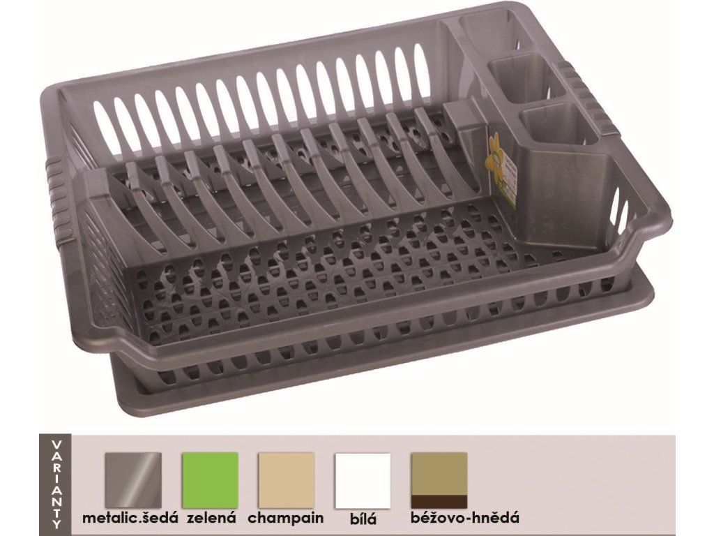 Odkapávač na nádobí s tácem. Členěný - sekce na příbory, talíře a na ostatní nádobí. Mix barev - dodáváme dle skladových zásob. Materiál - plast. Rozměry - 45x37x8,5 cm.