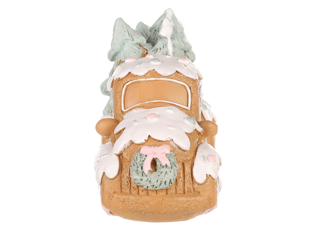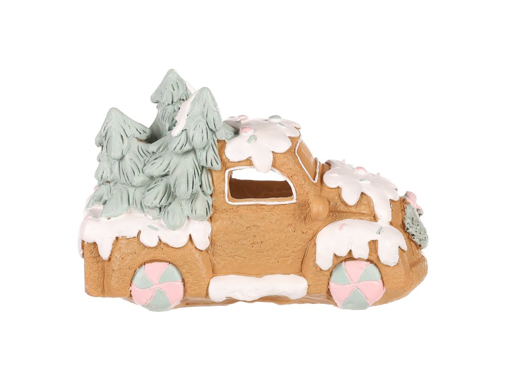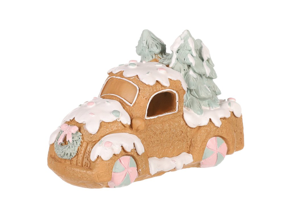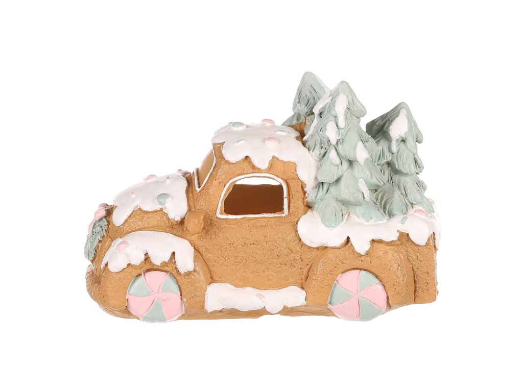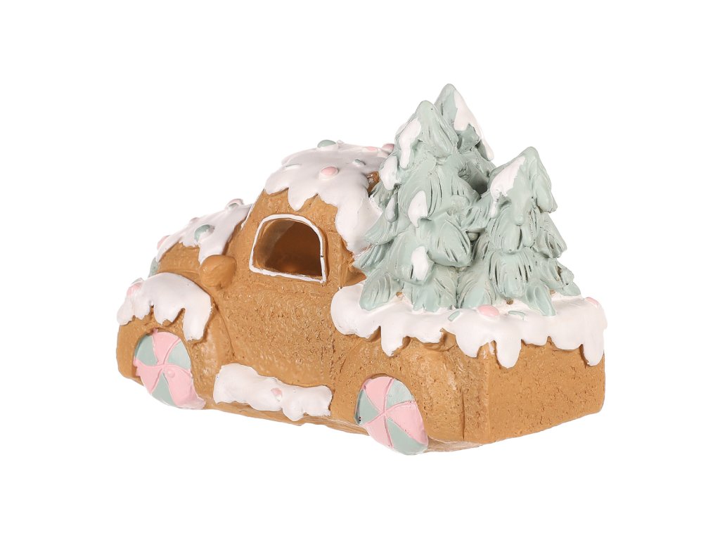 Dekorace z perníku patří k nejtypičtějším a nejkrásnějším ozdobám využívaným pro vánoční čas. Toto nádherně zdobené perníková autíčko z polyresinu, doplněné LED osvětlením uvnitř, bude skvělou volbou pro ozdobení poliček, stolů a dalších viditelných míst. Vypadá jako cukrářské mistrovské dílo, které umožňuje vytvořit neodolatelný světelný efekt díky pronikajícím paprskům světla skrze okénka ven. |