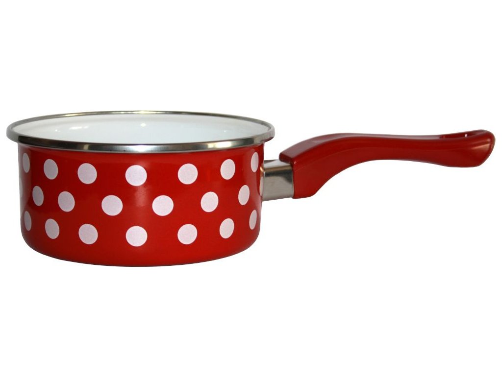 Červený rendlík s bílými puntíky o objemu 0,5 l. Materiál - smalt, plast. Rozměry - výška 6 cm, průměr 12 cm. Rendlík je vhodný na všechny typy varných ploch včetně indukce. Lze jej použít do myčky nádobí.
