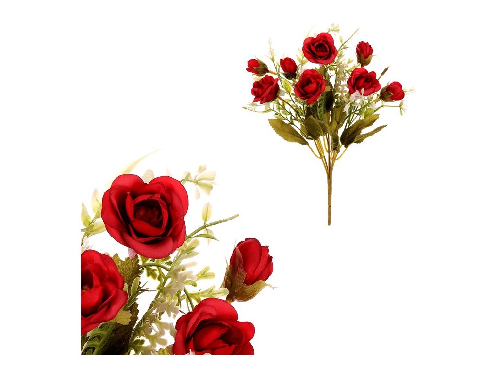 Kytice umělých růží s červenou barvou květů bude působivou květinovou dekorací. Její krása časem neuvadne a můžete tak využívat tuto umělou květinu opakovaně, nebo ji mít jako trvalou ozdobu. Vynikne sama o sobě v pěkné váze, nebo může být součástí ucelené květinové výzdoby pro různé oslavy, či jiné společenské události. Nemusíte si dělat starosti s údržbou a zaléváním, neboť jako umělá, nepotřebuje žádnou péči, a přitom vypadá fantasticky. Je věrohodnou kopií živé varianty, a tak při letmém pohledu na ní, ji ani nerozeznáte od originálu.
