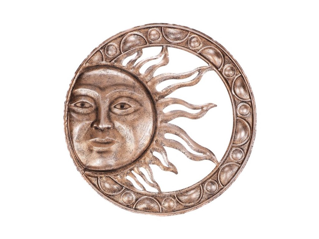 Tato jedinečná dekorace v kombinaci měděných a stříbrných tónů přináší motiv slunce s obličejem, umístěného na boku kruhu. Elegantní spojení barev a asymetrický design dodají vašemu prostoru originální a příjemnou atmosféru. Skvělý doplněk pro interiéry i venkovní zdi.