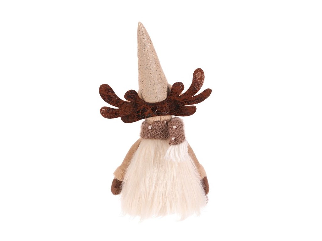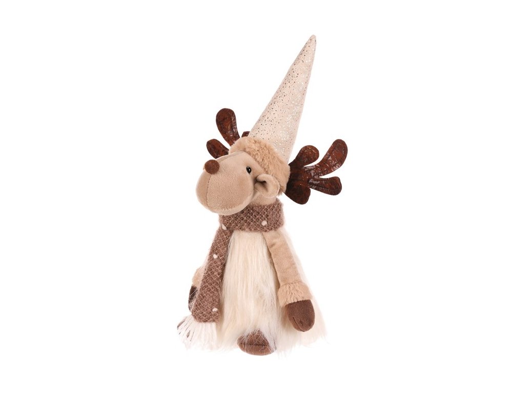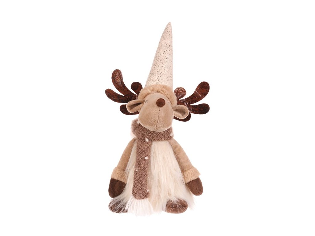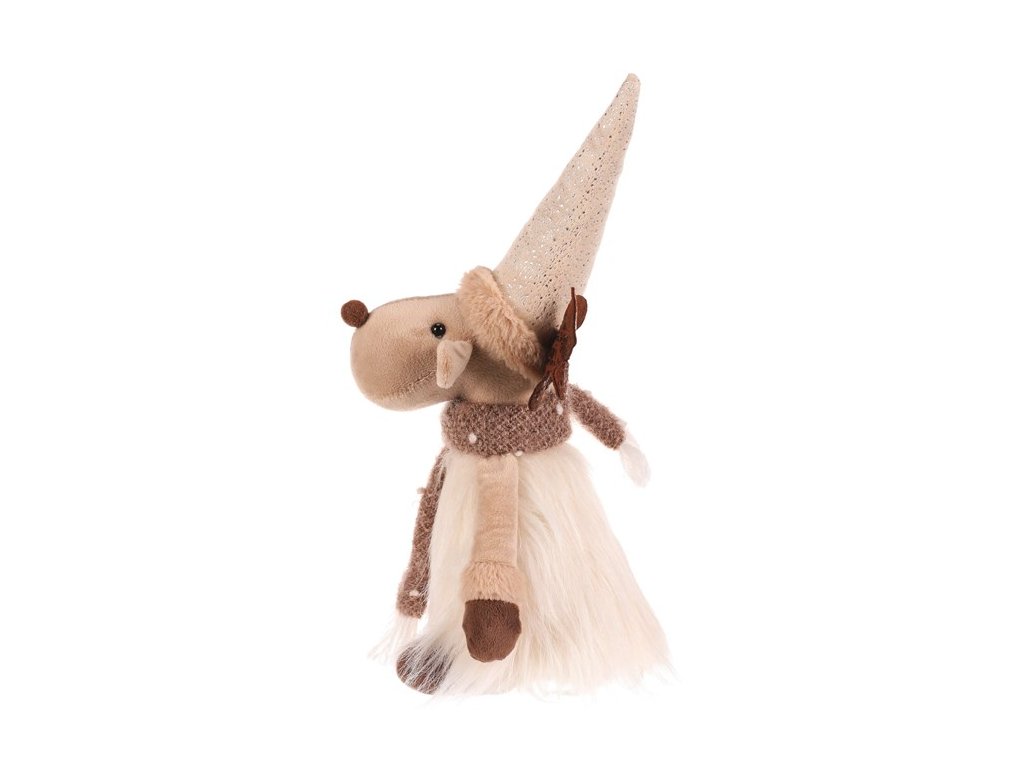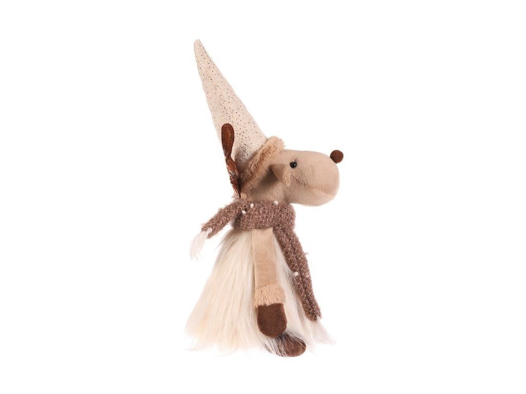 Látkový sob v béžovo-hnědém teplém oblečení vnese do vašeho domova veselou a hřejivou atmosféru. Jeho roztomilý obličej, špičatá čepice s bambulí a celkově veselý vzhled zútulní každý interiér. Tato látková figurka, hebká na dotek, se skvěle hodí jako dekorace na poličku, stůl nebo ji můžete umístit i na pohovku nebo gauč, kde bude vaším hravým společníkem.