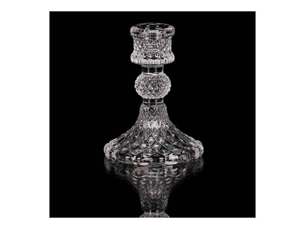 Skleněný svícen na kónickou svíčku s výškou 11 cm z čirého broušeného skla. Jeho elegantní design vynikne v každém interiéru, a díky své hmotnosti bude stabilní a bezpečný pro ozdobení stolů a poliček. Jedná se o působivou dekoraci, která po zapálení svíčky rozzáří prostor neodolatelnými třpytivými odlesky všemi směry.