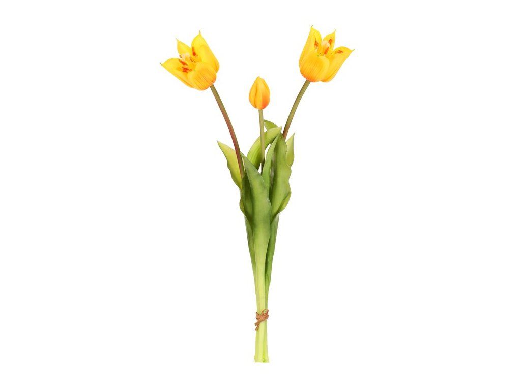 Svazek tří umělých tulipánů v jasně žlutém odstínu přináší do interiéru svěží a trvalou dekoraci. Každý květ je vyroben z plastu, který věrně imituje přirozenou strukturu okvětních lístků i listů. Svazek je svázán přírodním provázkem, což podtrhuje jeho jednoduchý a přirozený vzhled. Vynikne v minimalistických i bohatě zařízených prostorách, kde dodá barvu a živost bez nutnosti péče.