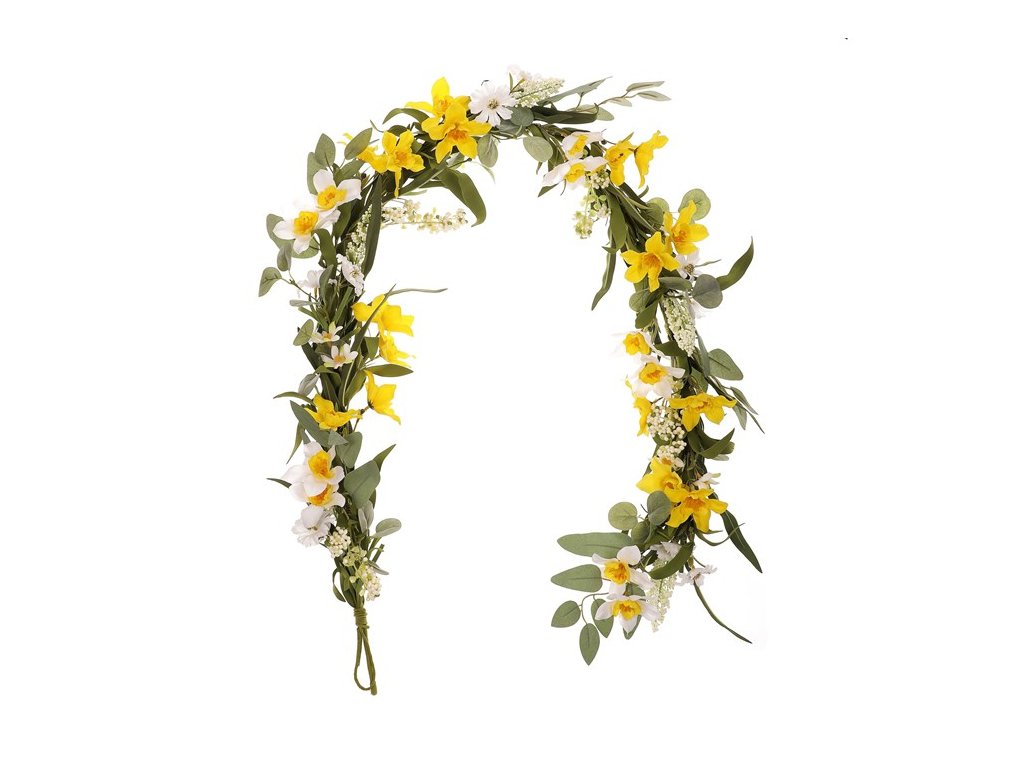 Tato 150 cm dlouhá girlanda s proutěným základem je zdobena žluto-zelenými umělými květinami a zelení. Ideální jako trvalá jarní dekorace, která přinese svěžest a živé barvy do vašeho domova, ať už ji zavěsíte na dveře, zábradlí nebo jiná místa.