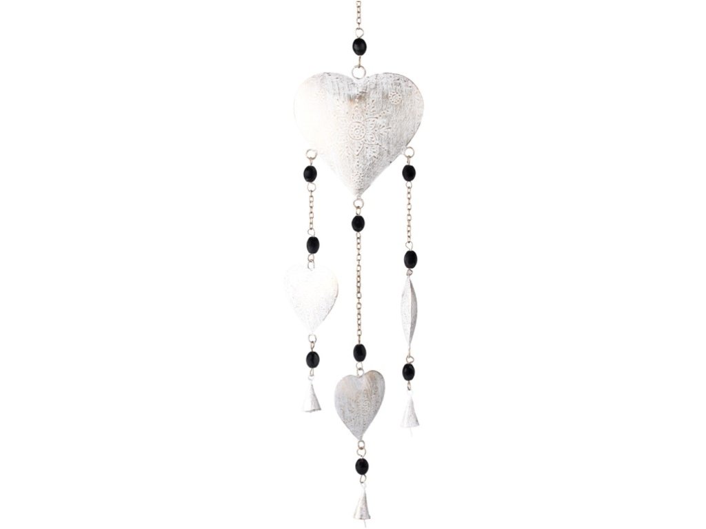 Lehká závěsná kovová dekorace s motivem srdíček v bílé barvě je ideální na zavěšení do interiéru – na kliku, háček, věšák nebo jako doplněk dárkového balení. Jemný rustikální vzhled a decentní barva vytvářejí útulnou a láskyplnou atmosféru.